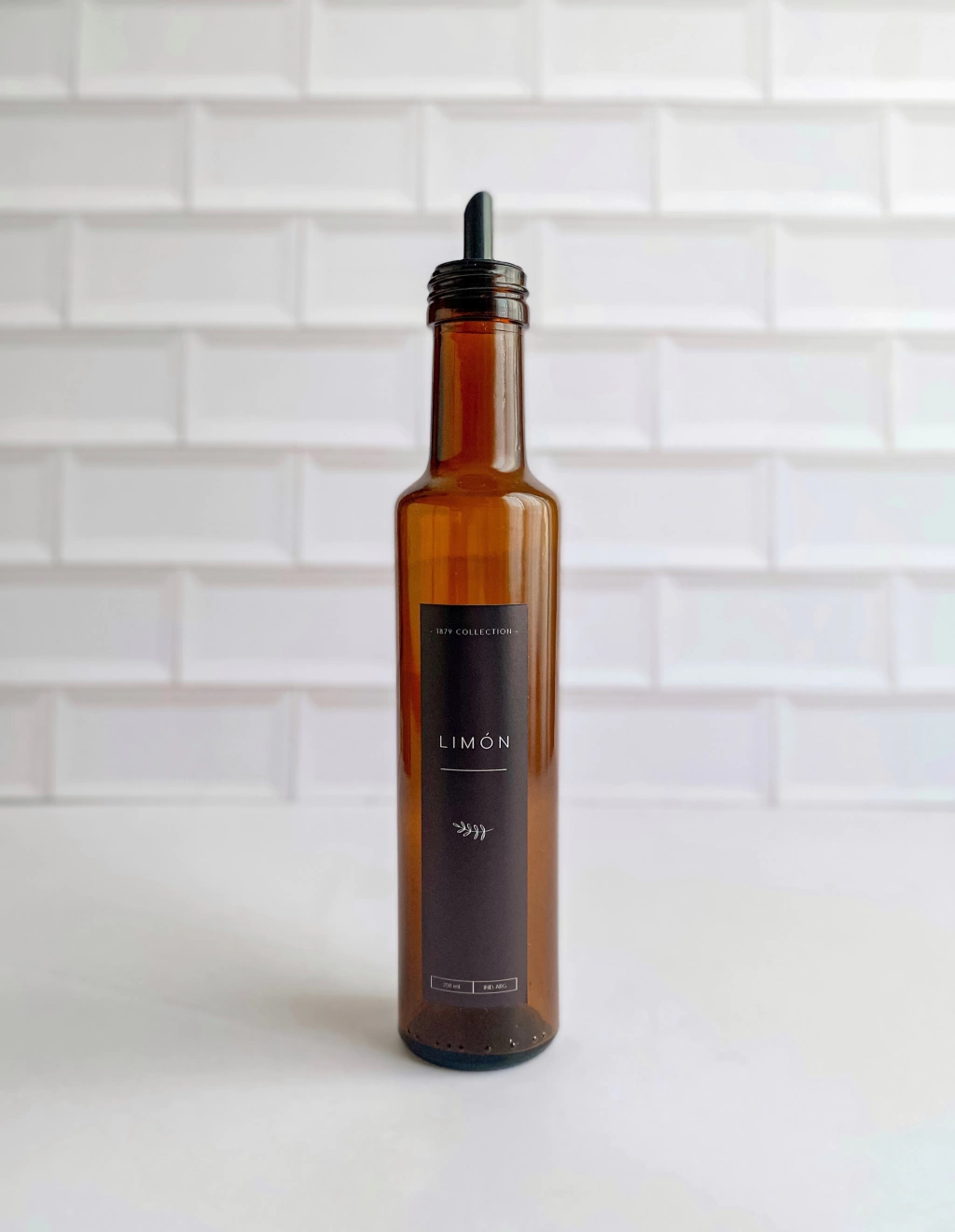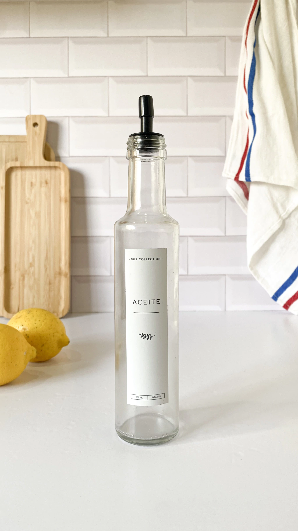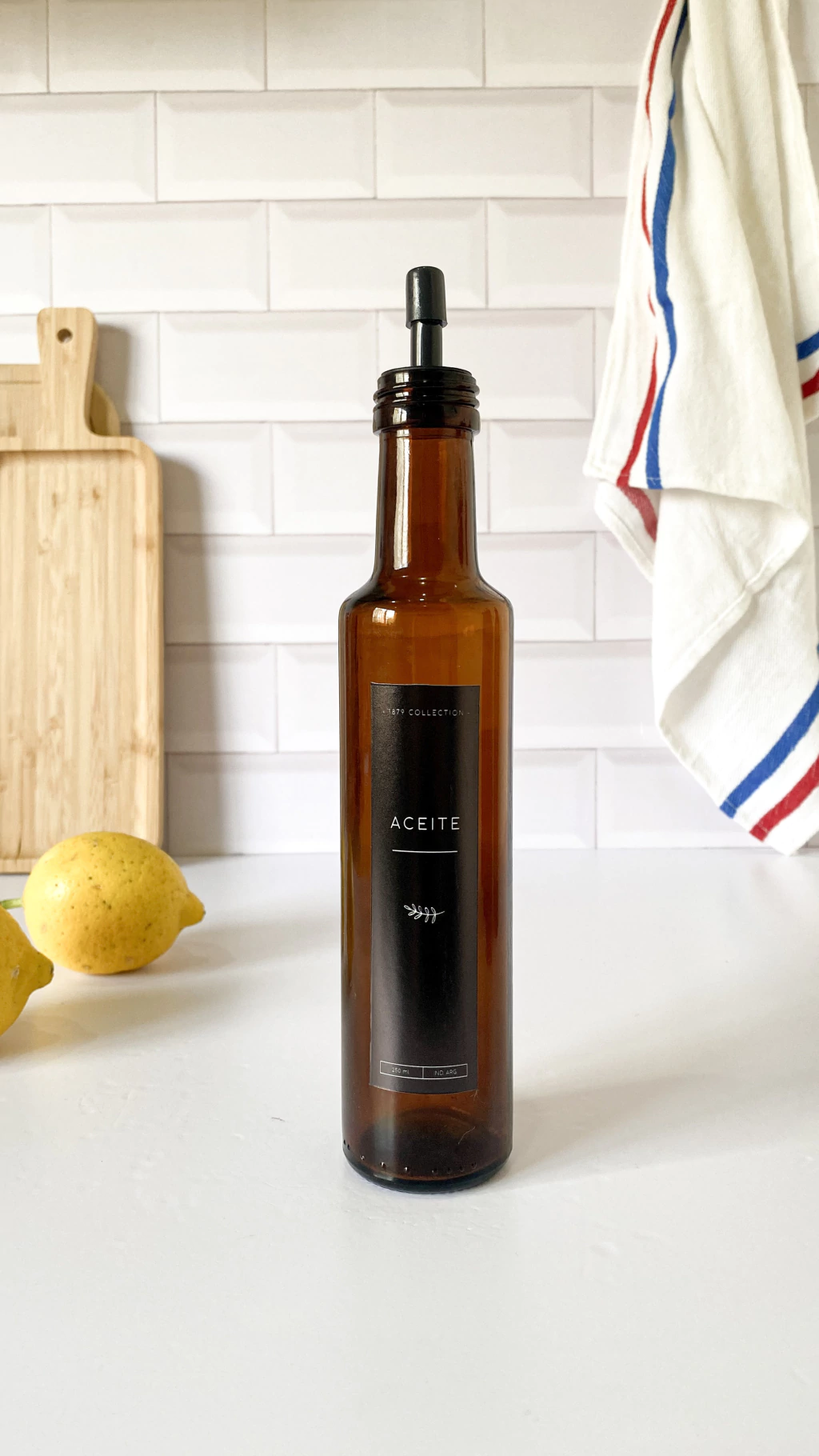 Envase aceitero cilíndrico de vidrio (Ámbar o Transparente) con pico vertedor, más ETIQUETAS en color BLANCO o NEGRO a elección.
