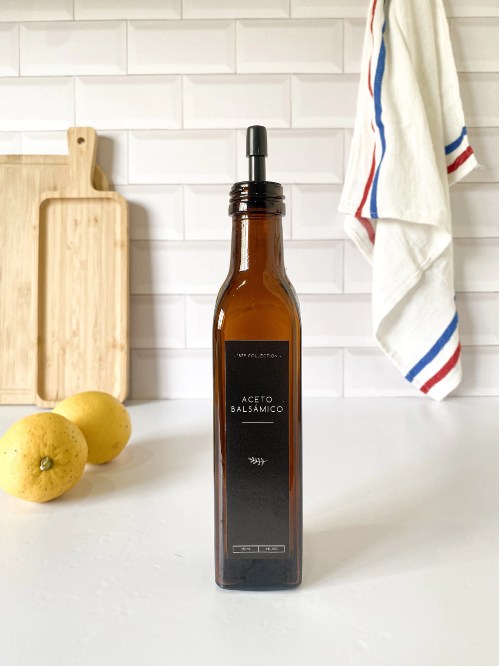 Envase aceitero cuadrado de vidrio Ámbar con pico vertedor, más ETIQUETAS en color BLANCO o NEGRO a elección.