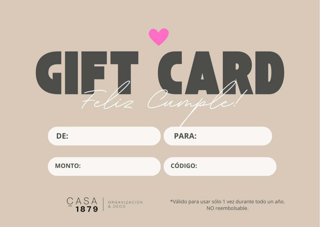 La persona que reciba su GIFT CARD va a poder llenar su carrito con todos los productos que le hayan gustado en nuestra tienda online y canjearla súper fácil colocando el código recibido (único y de un sólo uso) antes de finalizar la compra. Si la misma excede el monto de la GIFT CARD, podrá abonar la diferencia. Tendrá tiempo de usarla durante todo un año!